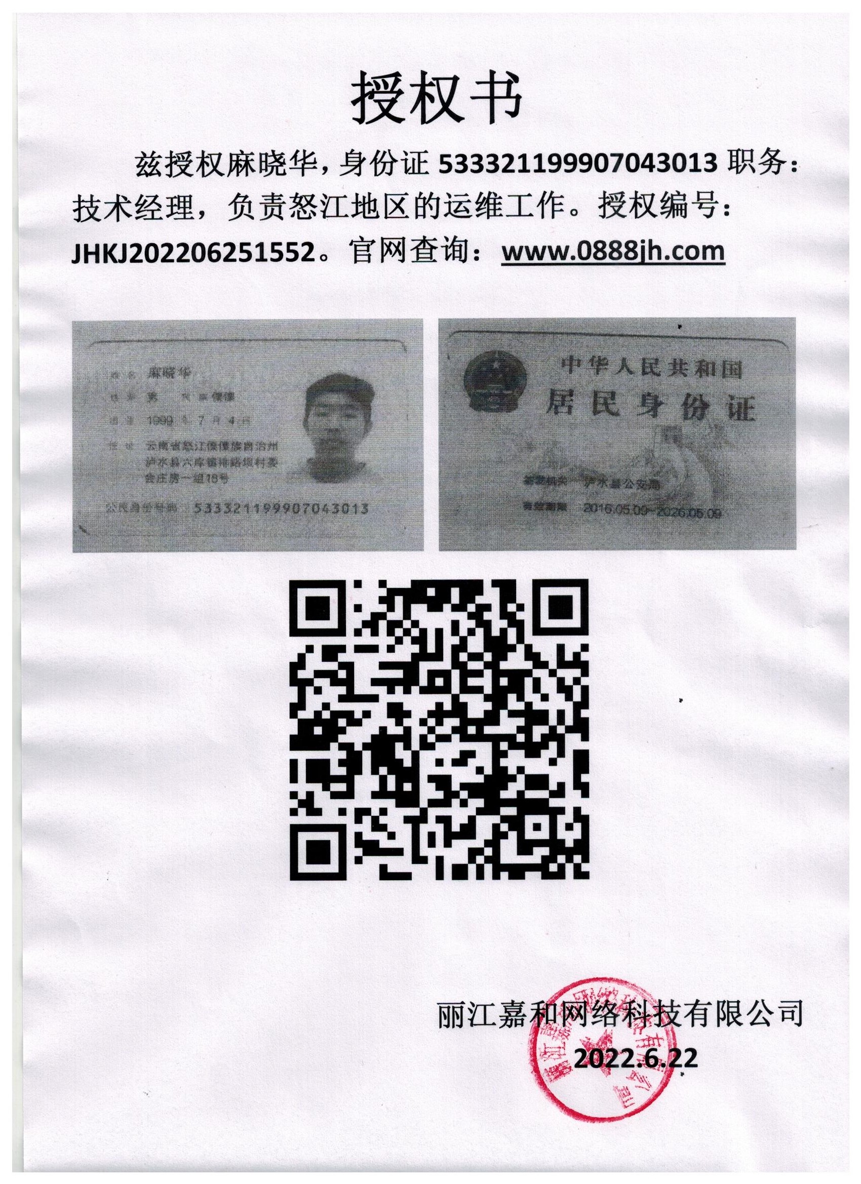 茲授權(quán)麻曉華負(fù)責(zé)怒江地區(qū)的運(yùn)維工作(授權(quán)編號(hào):JHKJ202206251552)