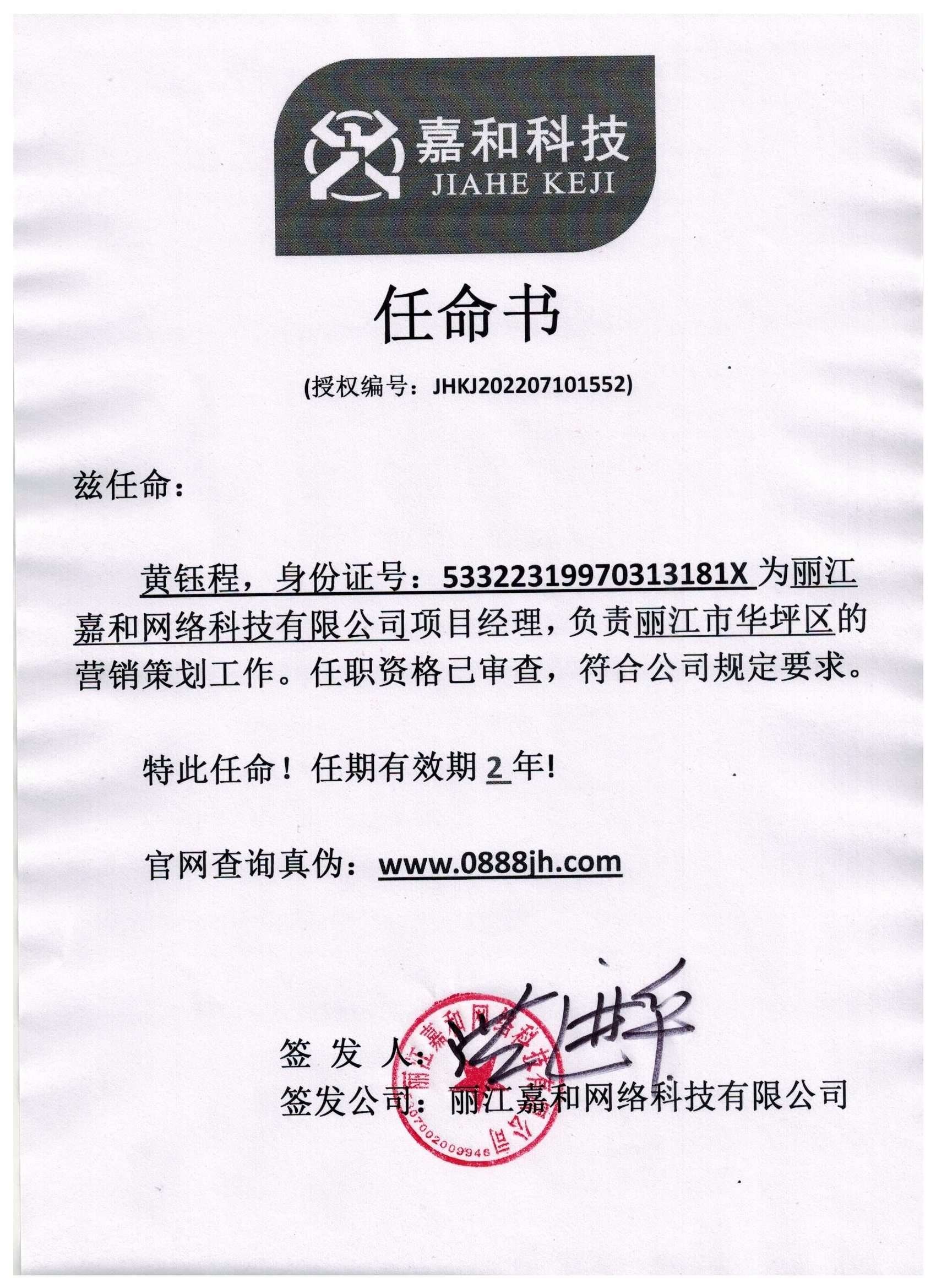茲任命黃鈺程為麗江市華坪區(qū)項(xiàng)目經(jīng)理