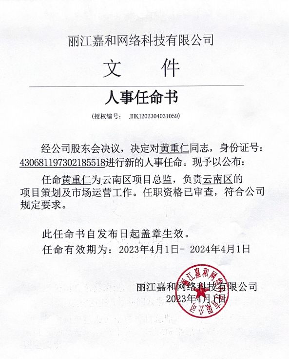 關(guān)于任命黃重仁同志為云南區(qū)項目總監(jiān)公告