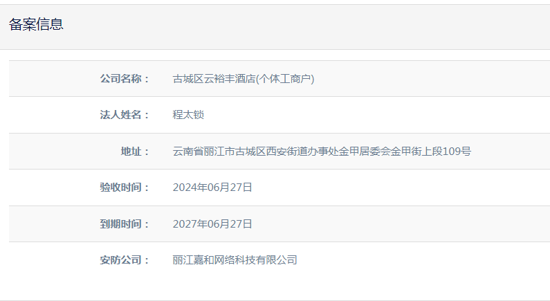 關(guān)于麗江和府酒店有限公司英迪格酒店電子監(jiān)控安防合格證下證通知
