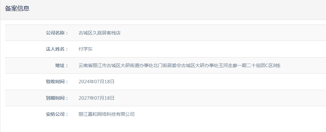 關(guān)于古城區(qū)久庭居客棧店電子監(jiān)控安防合格證下證通知