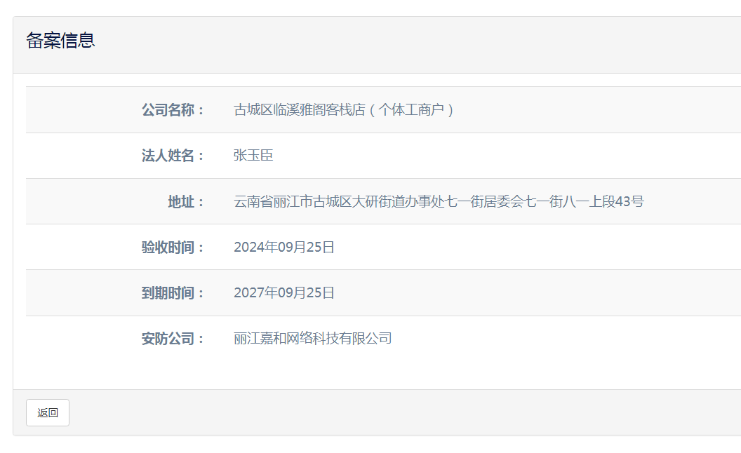 古城區(qū)臨溪雅閣客棧店(個體工商戶)電子監(jiān)控安防合格證下證通知