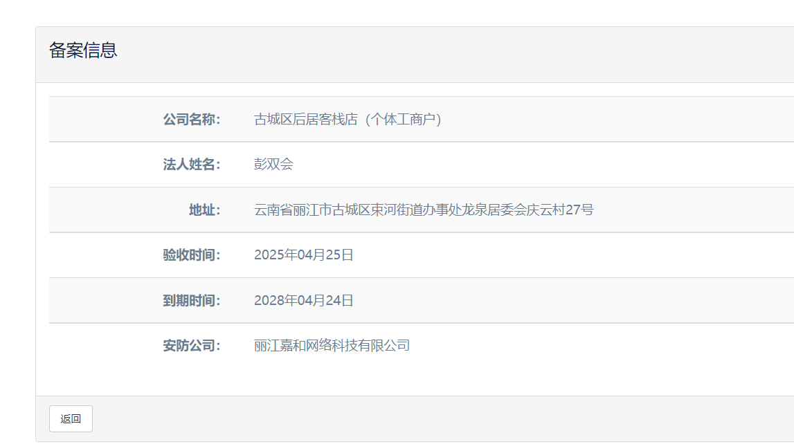 關(guān)于古城區(qū)后居客棧店(個(gè)體工商戶)電子監(jiān)控安防合格證下證通知