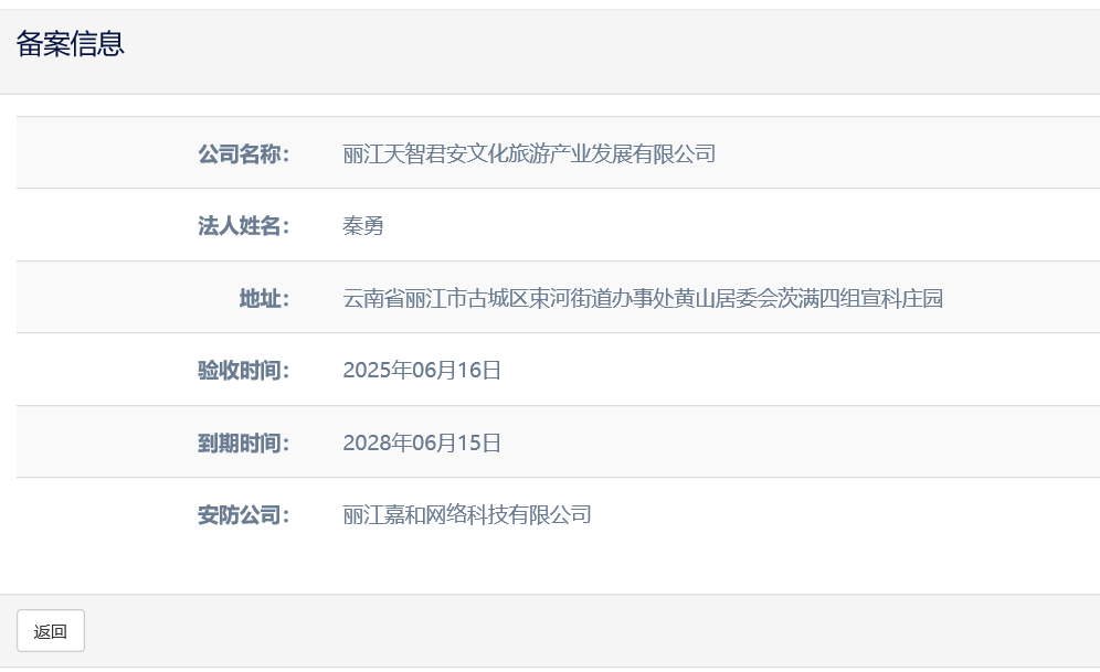 關(guān)于麗江天智君安文化旅游產(chǎn)業(yè)發(fā)展有限公司 電子監(jiān)控安防合格證下證通知