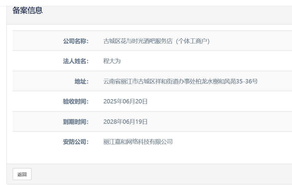 關(guān)于古城區(qū)花與時光酒吧服務(wù)店(個體工商戶)電子監(jiān)控安防合格證下證通知