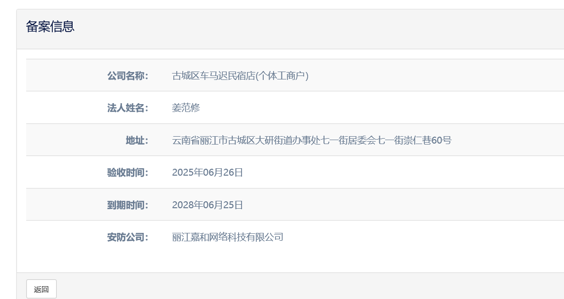 關(guān)于古城區(qū)車馬遲民宿店(個體工商戶)電子監(jiān)控安防合格證下證通知