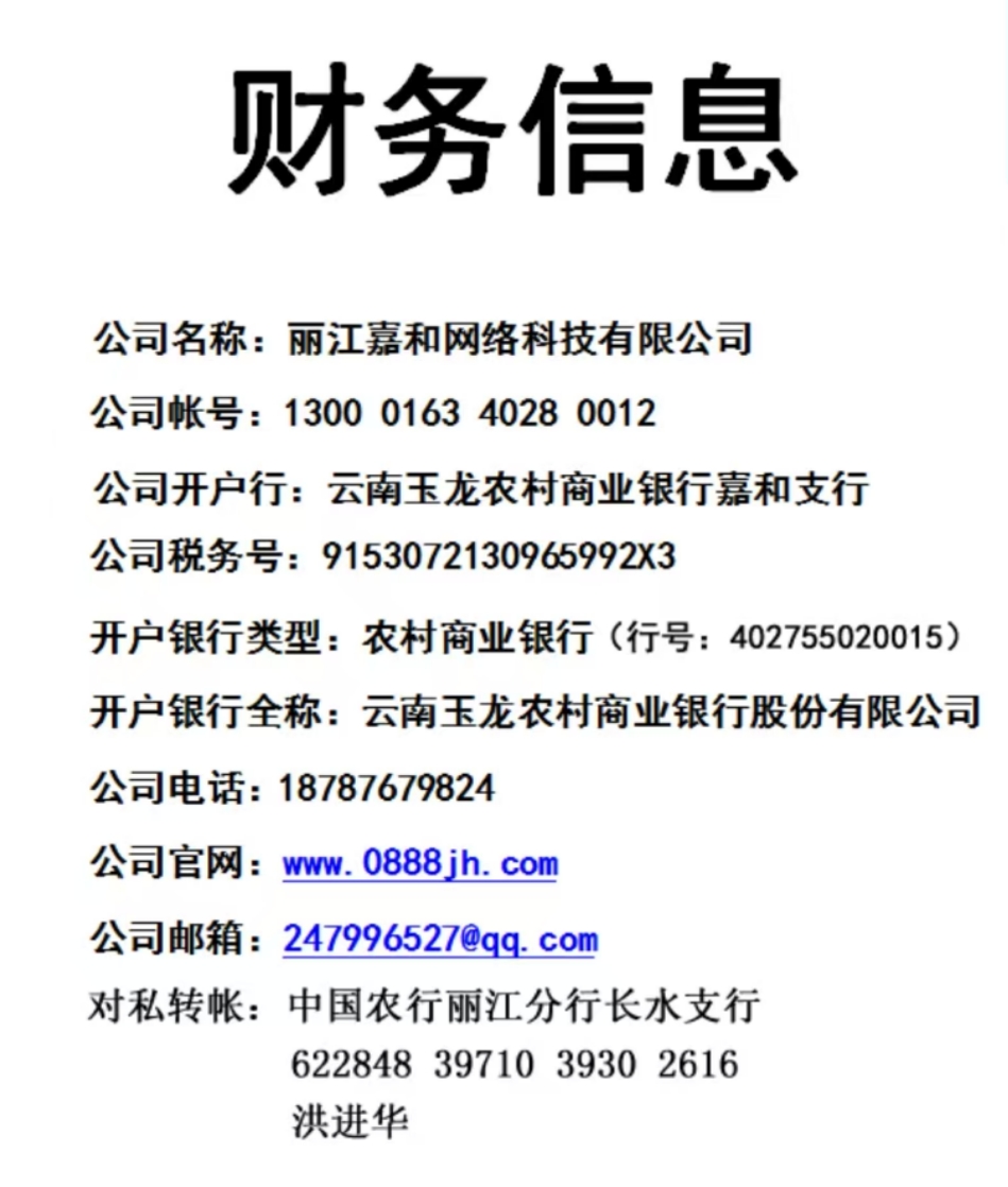 對(duì)公名稱:麗江嘉和網(wǎng)絡(luò)科技有限公司,公司帳號(hào):1300 0163 4028 0012,開(kāi)戶行:云南玉龍農(nóng)村商業(yè)銀行股份有限公司